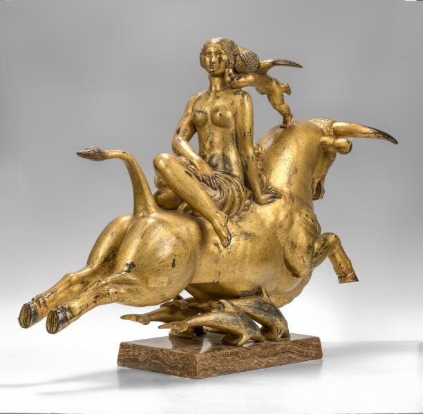 Io’s transformations took up a large part of Book 1, and she has a few bovine counterparts in Book 2. Mercury steals Apollo’s cattle and swore a human witness, Battus, to secrecy. But when Mercury comes back in a different form and Battus confesses, Mercury turns him to stone with a laugh. Then Jove turns himself into a bull, and just as Book 2 closes, he sweeps off young Europa from his “pasture” in Egypt, across the sea to Greece. The stories all get tangled up in each other and form a sort of overlapping web, running into each other over and over in a way that’s overwhelming. The repetitions are playful and artful, but because the content is so violent, the repetitions feel violent too.