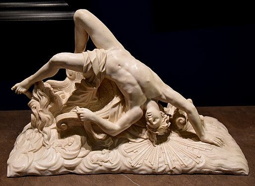 Last week, I shared a Twitter thread from Emily Wilson about Ovid’s Metamorphoses, in which she drew a connection between the myth of Phaethon and the climate crisis of the 21st century (the poet Eliza Griswold made this connection in a 2012 poem too). Phaethon is Apollo’s son, or so his mother says, but he doesn’t believe her — nor does he quite believe Apollo, who acknowledges him immediately. Prove it, he demands, and give me anything I ask; Apollo swears to do so and immediately regrets it when Phaethon asks to drive the chariot of the sun across the day sky. Phaethon loses control of the sun god’s chariot and sets the world on fire, drying up rivers and scorching the earth — although the sea levels drop rather than rise — in a way that reminds me of the recent fires in Australia: