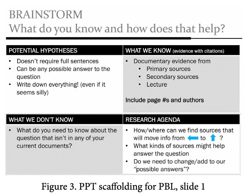 Active learning breaks in history lectures are a great and fairly easy way to incorporate more historical literacy skill-building into a course. A team of medical school educators experimented with a series of activities to develop historical thinking in lectures based around problem-based learning (learning by thinking through complex, discipline-specific real-world scenarios), and it's a framework that you could use to get students to think through any new topic: